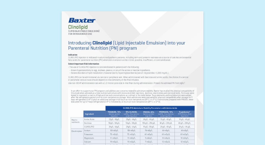 Click here for full Indication(s) and Important Risk Information and accompanying full Prescribing Information for CLINOLIPID.