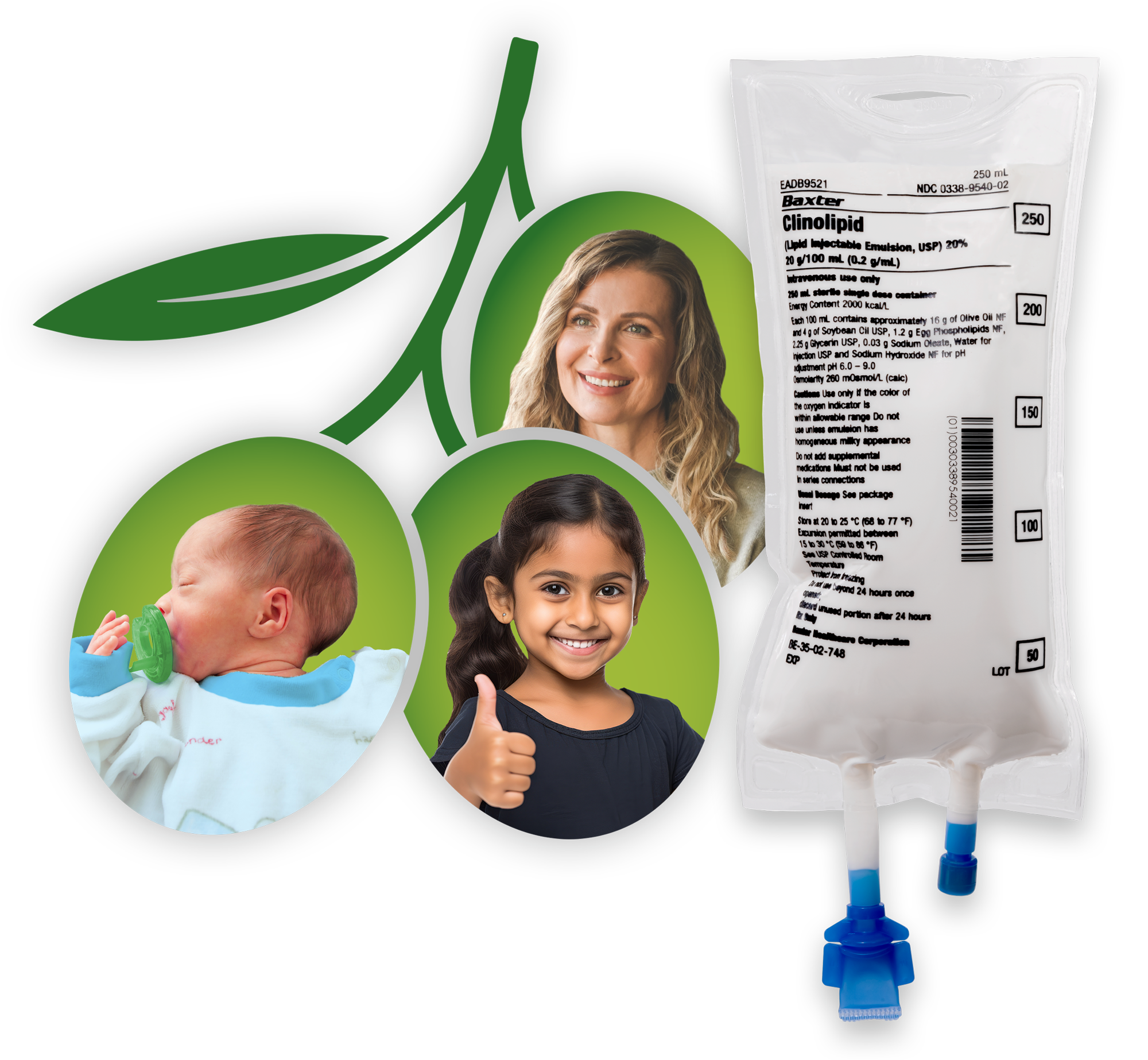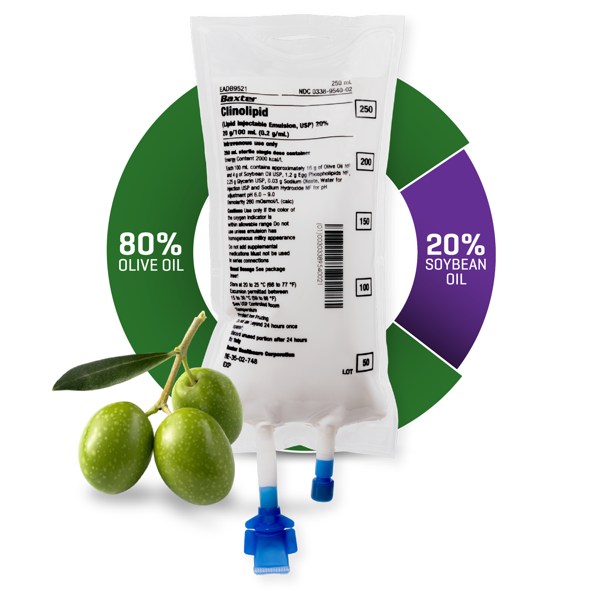 From neonates to adults, olive oil-based Clinolipid can be your first choice for providing a daily source of essential fatty acids and energy1—with 20% soybean oil, Clinolipid has the lowest amount of any mixed-oil ILE.1,7,8